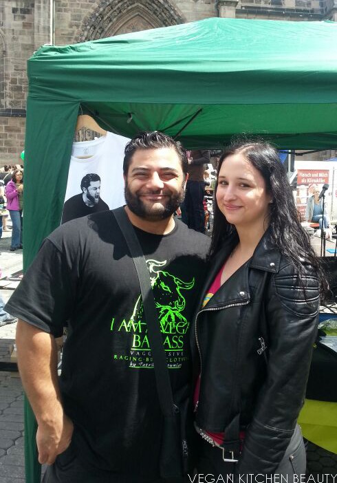 Auch Patrik Baboumian war mit seinem Vegan Bad Ass Stand auf dem Veggie-Straßenfest vertreten. Mein Schatz hat mir genau angesehen, dass ich gerne ein Foto mit ihm haben wollte. Ich hatte mich allerdings nicht getraut, da ich sonst keinen gesehen habe, der Patrik danach gefragt hat. Mein Freund hat mich dann solange bequatscht bis ich dann doch nachgefragt hatte :D
