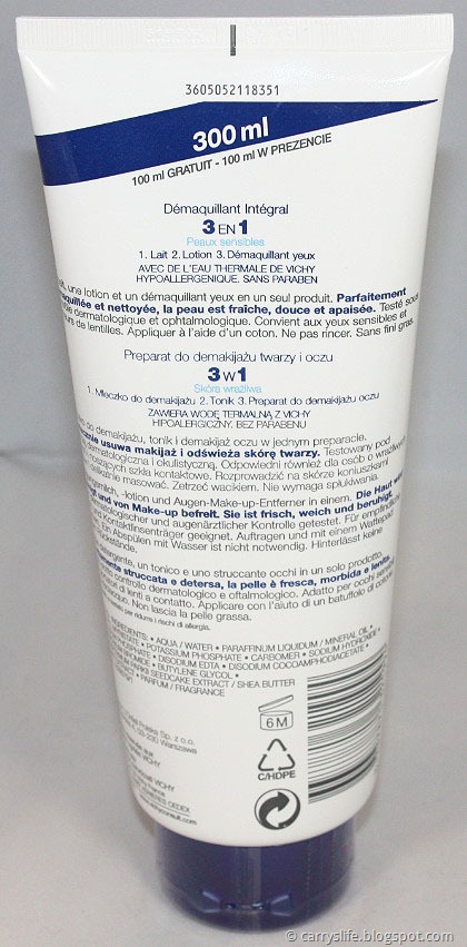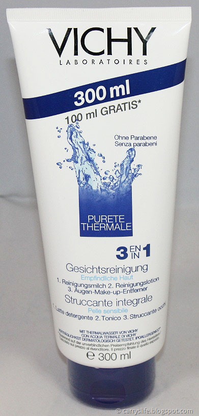 Heute möchte ich euch auch noch meine aktuelle Gesichtsreinigung vorstellen. Momentan nutze ich aus der Purete Thermale Serie von Vichy die 3 in 1 Gesichtsreinigung für empfindliche Haut. 3 in 1 deswegen, weil es Reinigungsmilch, Reinigungslotion und Augen-Make-up-Entferner in einem sind.