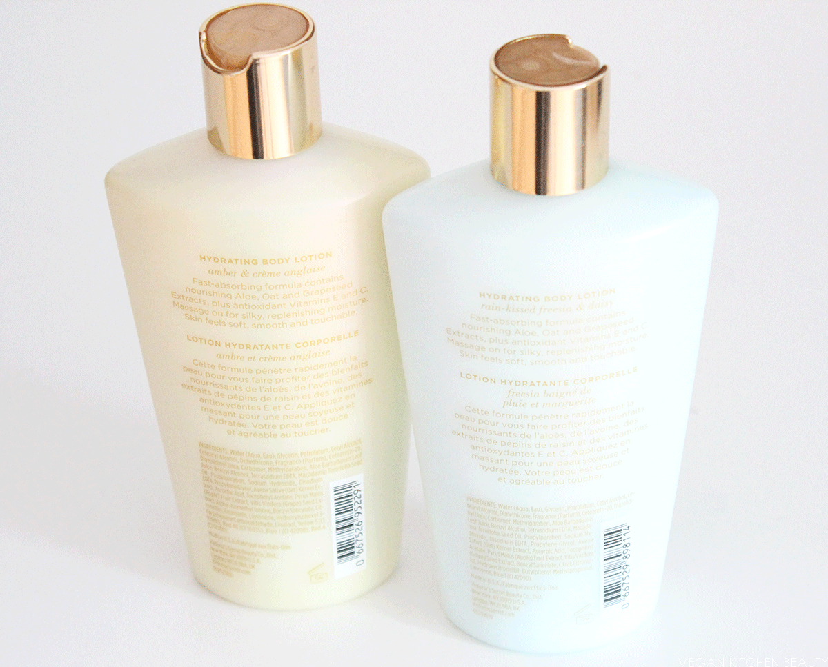 Die Bodylotions kommen in einer stabilen, milchigen Plastikverpackung in pastellgelb- oder blau. Was mir hier gut gefällt sind die jeweiligen goldenen Verschlüsse die man per Druck auf eine Seite öffnet. Das mag ich auch schon bei Duschgels sehr gerne. Auf der Vorderseite der Verpackungen sind sehr schön gestaltete Etiketten, passend zum Produktnamen, aufgeklebt – eine Freesie bzw. ein orange-gelbes Tuch. Das Etikett auf der Rückseite beinhaltet dann alle Informationen zu Produkt und Hersteller.